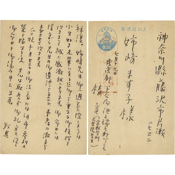 • 解説 姉崎ます子宛 昭和25年7月19日 ペン8行 「拝復。姉崎先生御一週忌に際しましては、小生如き未輩に至る迄御丁重なる御挨拶を頂きまして誠に感激到しとります。御命日には、陰ながら先生の御遺徳を慕ひ、弔孝の微意を表させて頂きます。 ~」