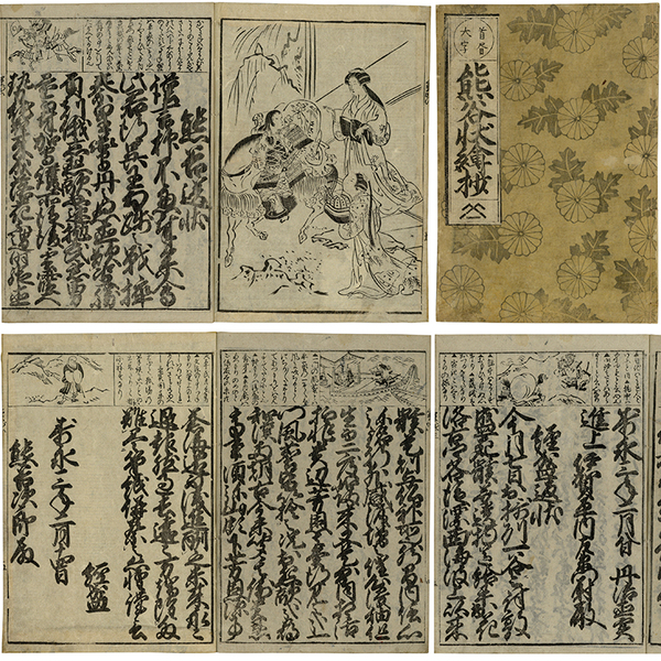 • 解説 6枚表二表三共 表二に図・本文上部にカット 内題「熊谷送状」 原表紙 原題簽「首書大字 熊谷状繪抄」 25×17.2糎 拵帙入