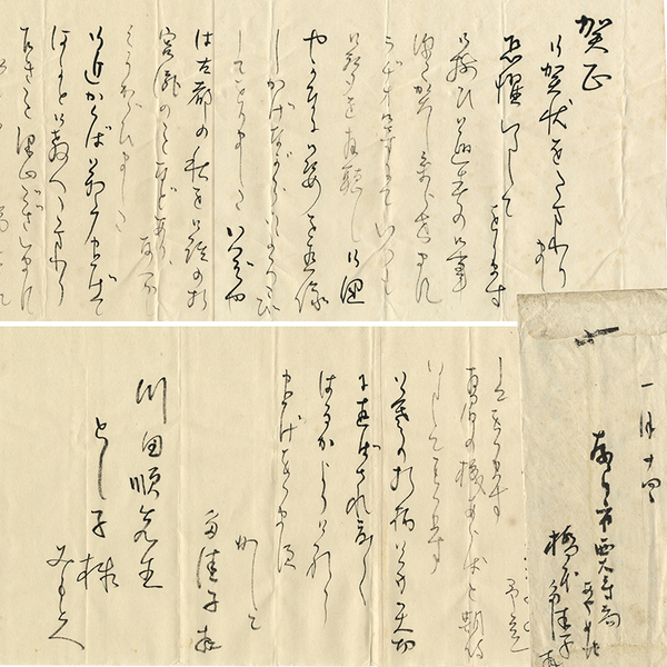 • 解説 川田順・とし子宛 昭和30年代1月14日 毛筆68行 封筒付 「賀正 御賀状をたまわりまして恐縮いたしてをります ~ ラヂオ等にていつも御聲を拝聴し ~」