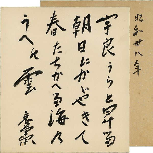 • 解説 『宇良うらと 昇る朝日に かゞやきて 春たちかへる 海のうえの雲 哀草果』 裏面に「昭和丗八年」