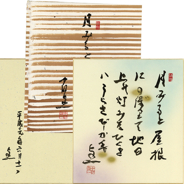 • 解説 『[落款]月みると 屋根にのぼりて 地の上の 灯みなひくき うらさびしかも 与一[落款]』 裏面に「平成元年六月十一日」自題たとう付「月みると 中河与一[落款]」