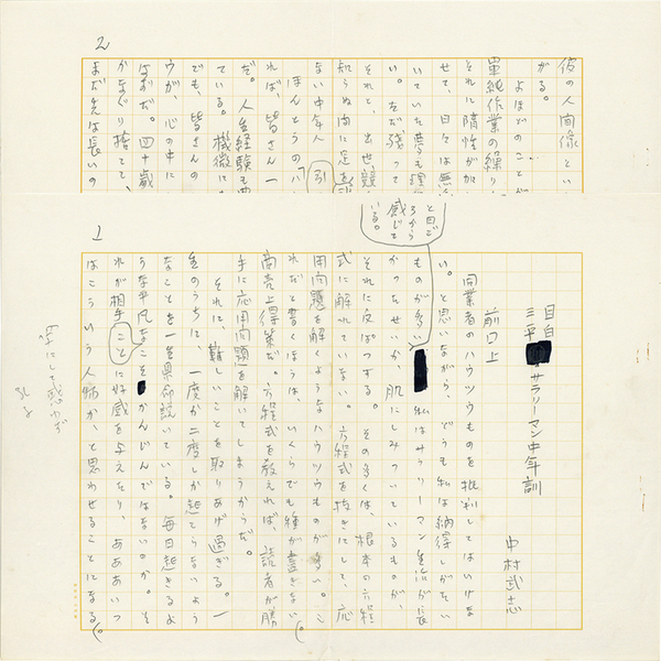 • 解説 『目白三平 サラリーマン中年訓』 鉛筆400字詰完 「前口上 同業者のハウツウものを批判してはいけまい。と思いながら、どうも私は納得しがたいものが多いと日ごろから感じている。~」