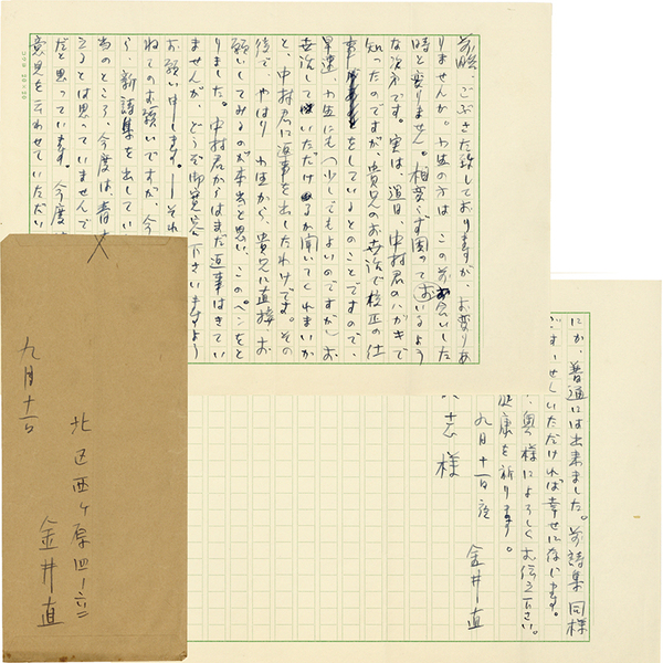 • 解説 槙晧志宛 昭和33年9月11日 ペン26行 封筒付 「~ 実は、過日、中村君のハガキで知ったのですが、貴兄のお世話で校正の仕事をしているとのことですので、早速、小生にも(少しでもよいのですが)お世話していただけるか聞いてくれまいかと、~」