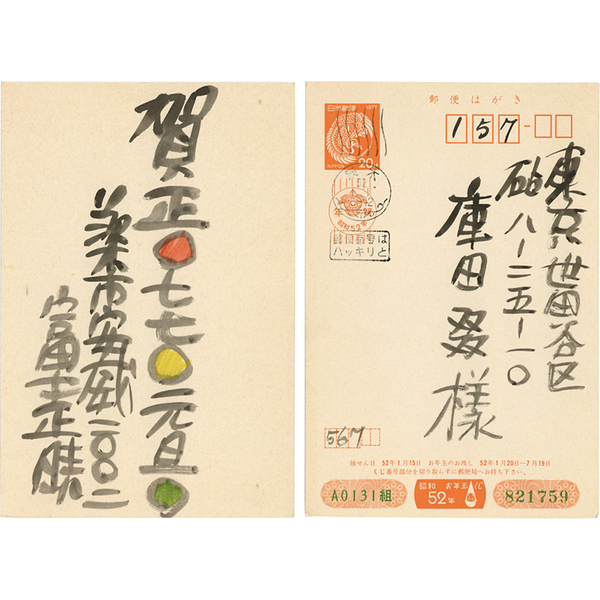 • 解説 庫田?宛 昭和52年元旦 毛筆3行 「賀正○七七〇元旦○ 茨木市安威二〇〇二 富士正晴」 昭和52年=1977年