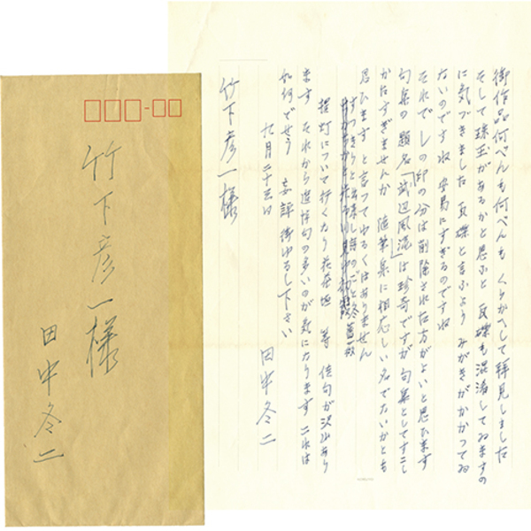 • 解説 竹下彦一宛 9月23日 ペン14行 手渡し封筒付 「御作品何べんも何べんもくりかへして拝見しました そして珠玉があるかと思ふと瓦礫も混淆してゐますのに気づきました ~」 文面より批評・添削の添え文かと思われる。