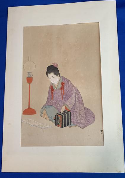 湯川松堂・錦絵、手摺り多色木版画、『洋ランプの元で、風琴の楽譜を見る、高貴な夫人ノ図』(仮題)