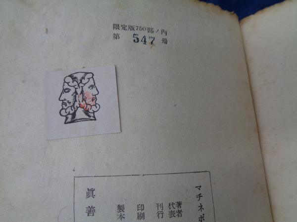 • 解説 背欠け、補修有。扉に記名、書き込み有。裏見返し欠、奥付裏ページ貼りつき、書き込み有。