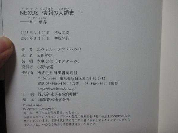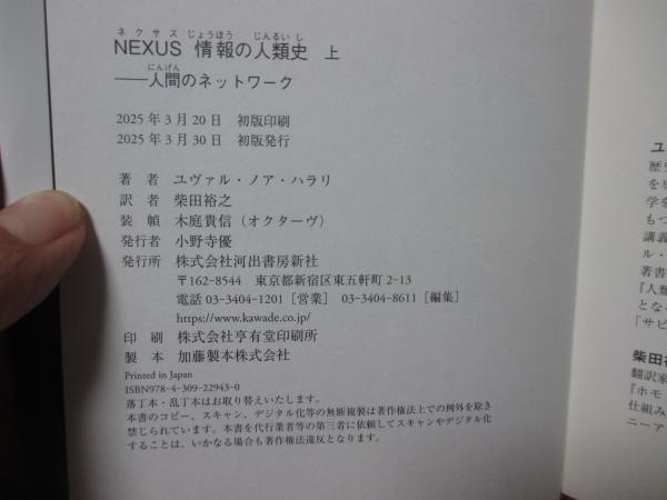 • 解説 「NEXUS 情報の人類史: 人間のネットワーク」上・下巻セットです。写真掲載しているように、カバーの周縁部に、若干のヨレがあります。きれいな状態で読んでいただきたいので、OPPで透明カバーを巻いて、発送します(簡単に取れますし、本体に直接、接着しないので、跡が残ることもありません)。ご了解ください。本の中身に問題はありません。上・下巻ともに、2025年発行・初版1刷。(帯付)で、ページ・カバー破れ、落丁、書き込みはありません。2冊をひとまとめにして、レターパック・プラス(追跡可能)で、即時発送します。宜しくお願いします。