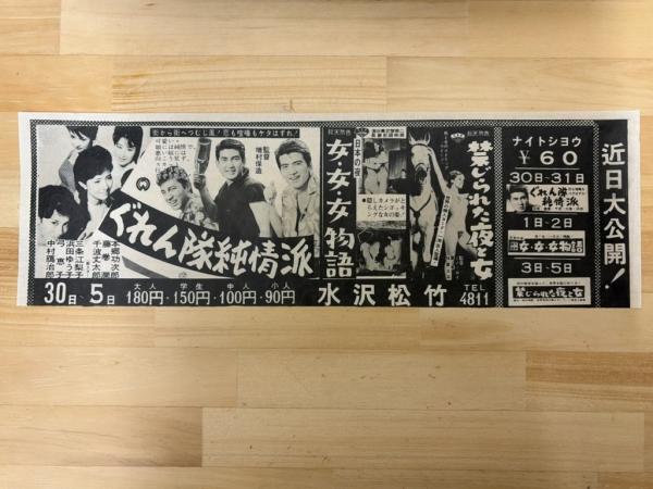 映画チラシ ぐれん隊純情派・女女女物語・禁じられた夜と女 水沢松竹