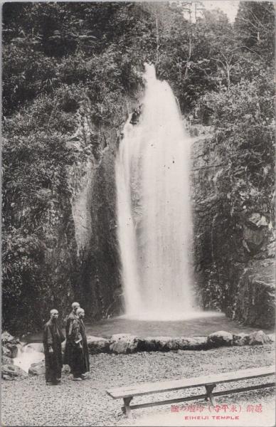 1000748■戦前 絵葉書■福井 越後(永平寺)玲瓏の瀧 (僧侶 3人)