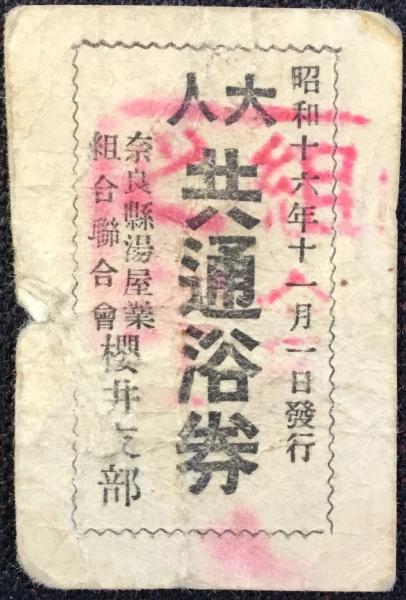 奈良県湯屋業組合聯合会櫻井支部発行『大人共通浴券』