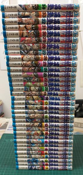 • 解説 オール初版、新書判サイズ、カバー付コミックの揃。経年並本揃ですが、一部3方薄茶ヤケ跡・5巻カバ背下フチ極少破レ(欠けていません)跡・26巻下カド全体少曲癖跡・34巻一部縛跡と地に1ヵ所打ちキズ跡あり。全冊中身背割レ開き癖も無く良好です。送料無料。