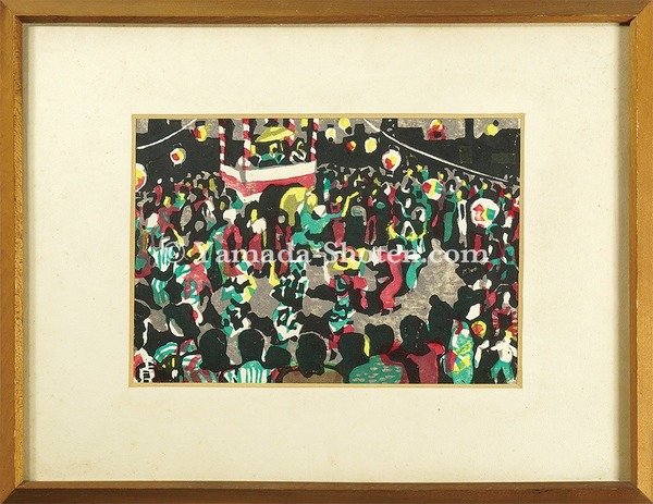 • 解説 木版16.7×23.5cm(イメージサイズ) / 31×40cm(額サイズ)額装(少傷ミ、少汚レ有)1面裏面テープヤケ  額に自筆裏書