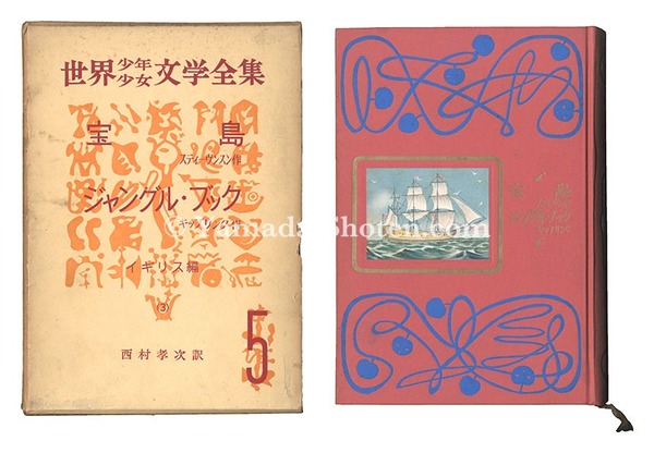 • 解説 ペン 墨彩 紙 5.7x6.7-20.5x14cm(イメージサイズ)「世界少年少女文学全集5 イギリス編3 宝島 ジャングル・ブック」(少傷ミ有)15枚'The Complete Works of World Literature for Boys and Girls / Volume 5, England Collection No. 3: Treasure Island and the Jungle Book' (tanned; box stained & dented, slightly damaged; book slightly stained)少シミ 少ヤケ 裏面貼付剥がし跡 9枚折レ 1枚左下角テープ貼付 サイン無