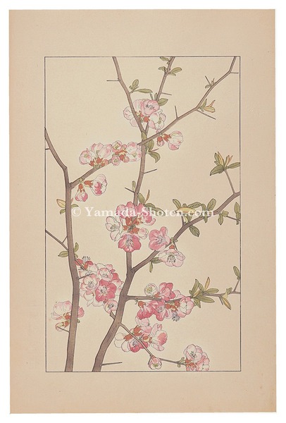 • 解説 木版 36.2x22.5cm(イメージサイズ)「鼠色一色の木版摺の投影写生図」「該当植物の写真図版付きの詳細な解説」3枚少ヤケ マージン少シミ  「非水百花譜」には初版と再版が存在する。震災によって版木が消失したため、非水の手元にあった原画を元に新たに版木を彫りおこして制作、春陽堂刊。摺は田口喜久松。作品裏に「非水百花譜著者検章」が貼られている。初版と再版では紙やインクなど質感が多少の変化が見られ、モチーフも5点が異なる。本作は再版の為、「鼠色一色の木版摺の投影写生図」と「該当植物の写真図版付きの詳細な解説」のそれぞれが独立して3枚で1セットとなっている。