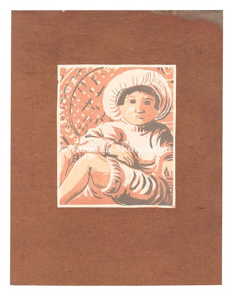 • 解説 木版 17.5x14.4cm(イメージサイズ)/34.6x26.8cm(台紙サイズ)ed.1001枚概ね良好  「きつつき版画集 第1号」より 自刻自摺 台紙(裏面に題箋の貼付。一部冠水シミ有)に貼付