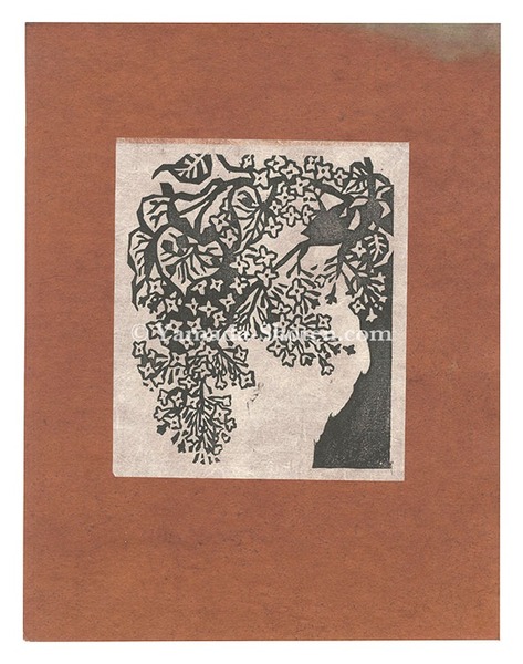 • 解説 木版 17.5x15cm(イメージサイズ)/34.7x26.8cm(台紙サイズ)ed.1001枚マージン一部台紙色移り 「きつつき版画集 第1号」より 自刻自摺 台紙(裏面に題箋の貼付。一部冠水シミ有)に貼付