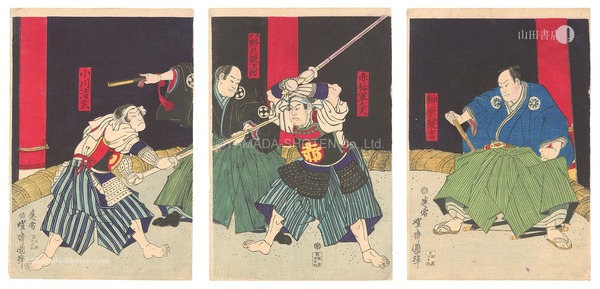 • 解説 Woodblock Print大判3枚続摺良 右図の顔部分少汚レ 少シワ 裏面貼付剥がし跡  左から 小川清武 見分 野見?次郎 赤松軍太夫 榊原鍵吉