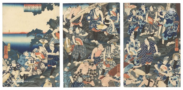 • 解説 Woodblock Print大判3枚続摺良 トリミング 少虫穴 少汚レ 少傷ミ 裏面貼付剥がし跡