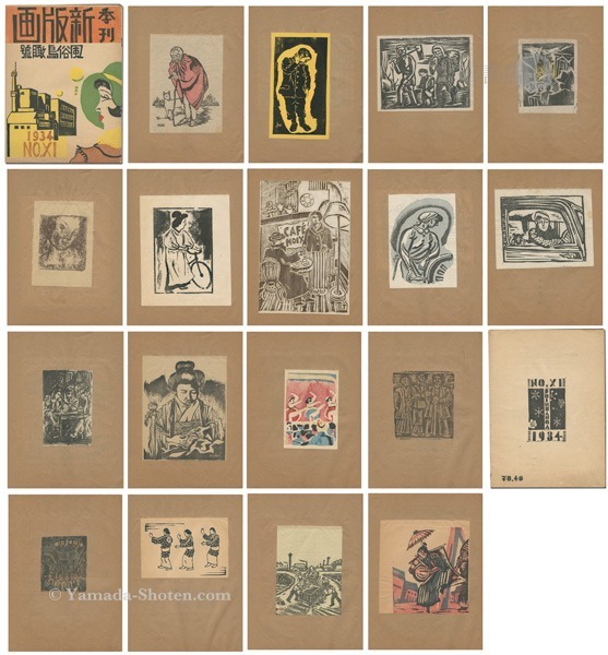 • 解説 木版 オフセット 刷込手彩色 全17枚 松下義雄:表紙/谷口薫美:赤毛布/江端芳市:学校にて/菊池善二郎:晩歸農村/藤牧義夫:銀行について/清水正博:酒場(オフセット)/松下義雄:針仕事/常察英雄:街の女/蓬田兵エ門:自転車と女/高瀬文治:喫茶店にて/水船六洲:機械を動かす女/河合光:競馬場/小野忠重:露地(刷込手彩色)/武藤完一:草に踊る/清水正博:ジャツ・ダンス(カッパ刷)/小野忠重:暴力稼業(刷込手彩色)/宇治山哲平:線路工事/吉田正三:街頭に踊る 29.5×21.5cm