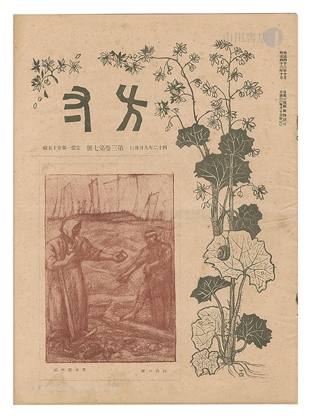 • 解説 16頁 木版 石版 ジンク版  表紙:坂本繁二郎「河沿の畑」 挿画:山本鼎「虹と茄子の花」「萱草」/森田恒友「梳髪」/織田一磨「十字花」/倉田白羊「ながし」 シミ 少ヤケ 少切レ 弱い中折レ 綴ジ外レ 一部角折レ 表紙少汚レ 30.8×22.6cm