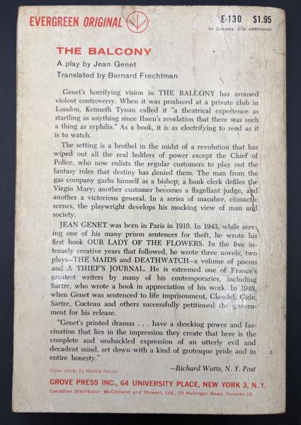 革命下の街にある「イリュージョン(幻想)の館」と呼ばれる高級娼館を舞台にした、ジュネの代表的な戯曲です。客たちが司教、判事、将軍といった権力者の役割を演じる「ごっこ遊び」を通して、権力、セクシャリティ、そして社会の本質的な偽善性を鋭く描いています。
