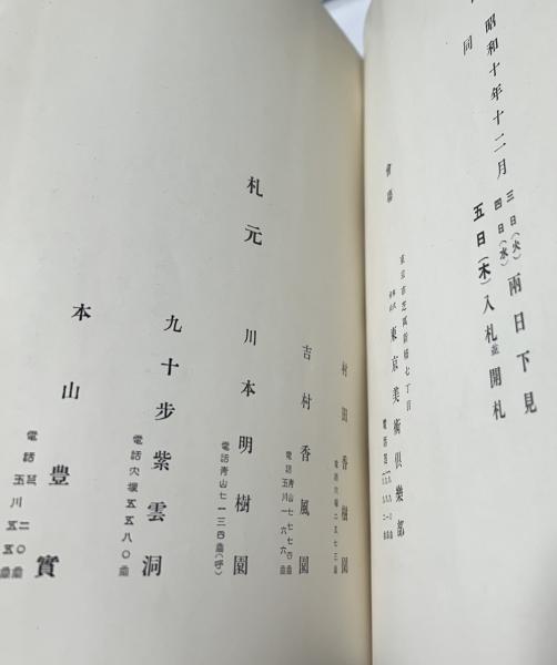 • 解説 売立目録 入札日:昭和10年12月5日 会場:東京美術倶楽部 少経年ヤケシミ 和装 表紙傷み、中央縦に折れ目、小さな穴 紐外れ 小口側地角シミ汚れ 背にタイトルを墨書き 扉に骨董屋の印 札元に村田果樹園等 338図版 19.5x26.5cm
