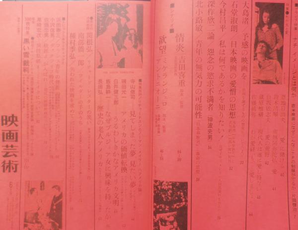 大島渚/予感の映画を 石堂淑朗/日本映画の愛憎の思想 今村昌平/私は何であるかを知りたい! シナリオ 情炎/吉田喜重 欲望/ミケランジェロ・アントニオーニ 寺山修司/見てしまった夢、見たい夢 飯島耕一/なぜブルジョア女に興味を持ったか 南部僑一郎/ワイルダーの手のうち 種村季弘/失われた映画を求めて “黒い雪”裁判 他