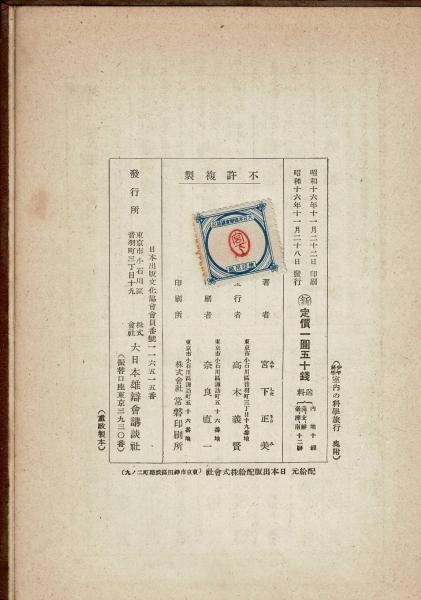 • 解説 昭和16年発行。裸本。裏見返しに記名。両見返しの複数個所に簿記印。中程度から強めの経年ヤケ。フチヤケ。