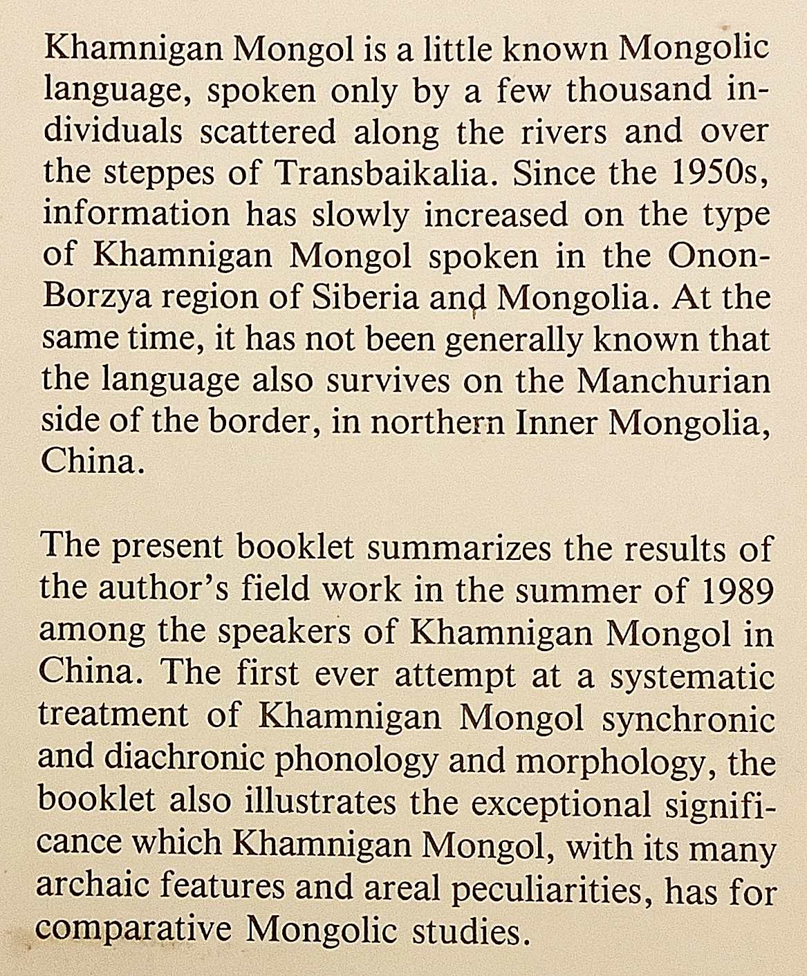 中国内モンゴル北部に居住するハムニガン人の言語を対象に、著者が1989年に実施したフィールドワークの成果をまとめた研究書。