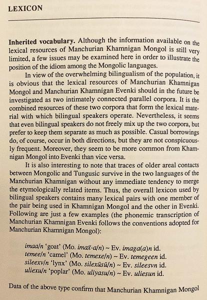 本書は音韻・形態を中心に体系的記述を試み、語彙面ではモンゴル語・ロシア語・中国語からの借用関係や、エヴェンキ語との並行的語彙構造にも言及するなど、北ユーラシア言語接触の具体相を示す貴重な一次資料である。