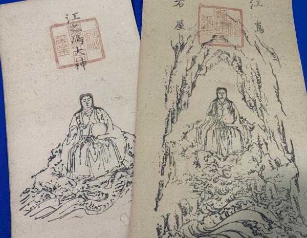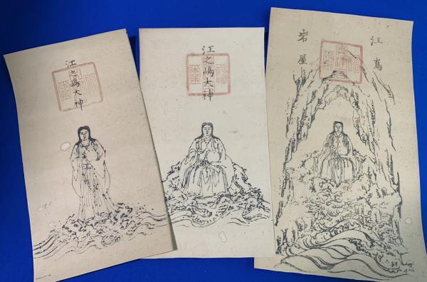 江嶋一望図・木版摺り(1枚)、江之島大神・木版御札(3枚)、合計4点セット