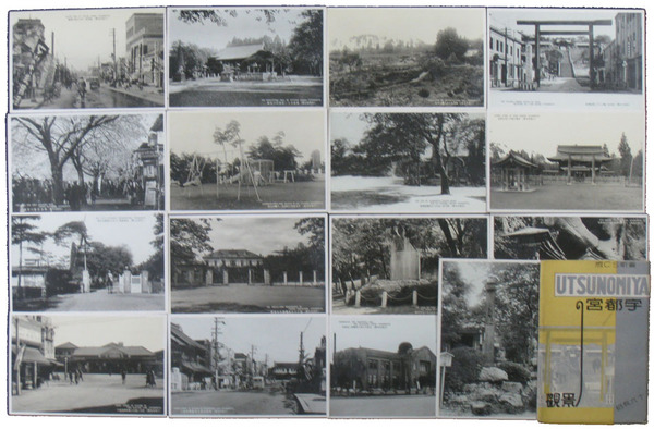 • 著者 絵葉書 モノクロ 省線駅前通り・中央大通の盛観・栃木県庁・商工奨励館・東武駅前通り他