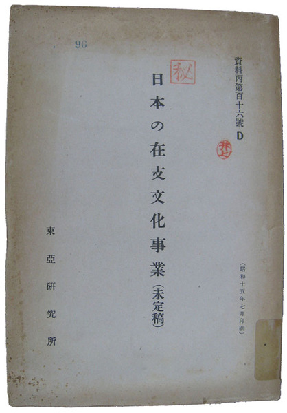 • 著者 背蔵書シール 228頁 布教事業・教育事業・医療事業・新聞通信及雑誌他 東亜研究所 第一調査委員会第一分科会(第三部)藤井正夫