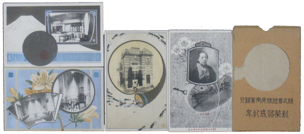 • 著者 絵葉書 周囲デザイン画・エンボス 銀行外観(東京府豊多摩郡大久保)・営業室・頭取妹尾キン他