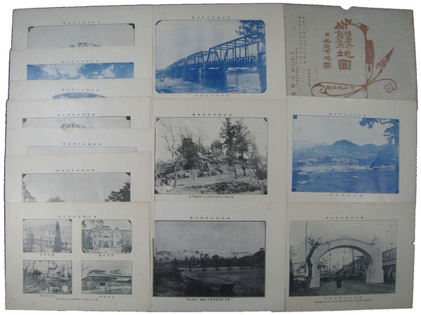 • 著者 20×27 12枚 福島市街全景・福島市本町四辻景・飯坂町全景・伊達郡湯野村河岸・共進会場景他 丸子吉司
