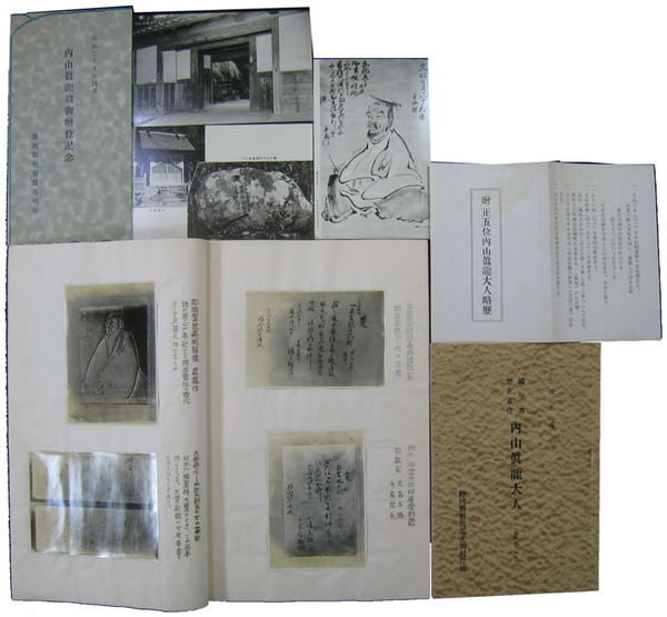 • 著者 3点 故内山真龍旌表に関する申請書 孔版10丁 写真貼込/小冊子「内山真龍大人」 22頁/記念絵葉書 袋付3枚 附略歴 静岡県磐田郡光明村