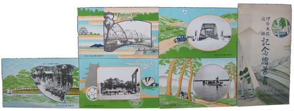 • 著者 絵葉書 周囲デザイン画 伊勢大橋正面・側面・渡船他 竣功祝賀協賛会 昭9
