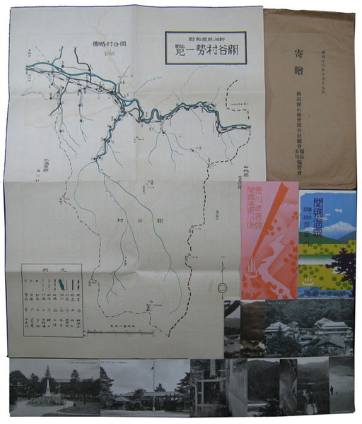• 著者 5点 関谷村勢一覧(裏面地図)/関谷村絵葉書 袋付7枚 尋常高等小学校・大蔵神社・荒川発電所堰堤他/関郷三温泉絵葉書 袋付3枚 湯澤温泉・鷹ノ巣温泉・高瀬温泉/関郷温泉パンフレット2種 新潟県山林会第20回総会寄贈封筒共
