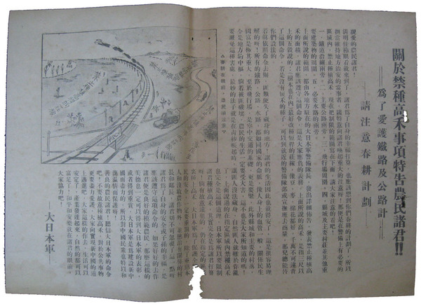 • 著者 少破・汚 26×38 「関於禁種高禾事項特告農民諸君! 請注意春耕計画…」 大日本軍