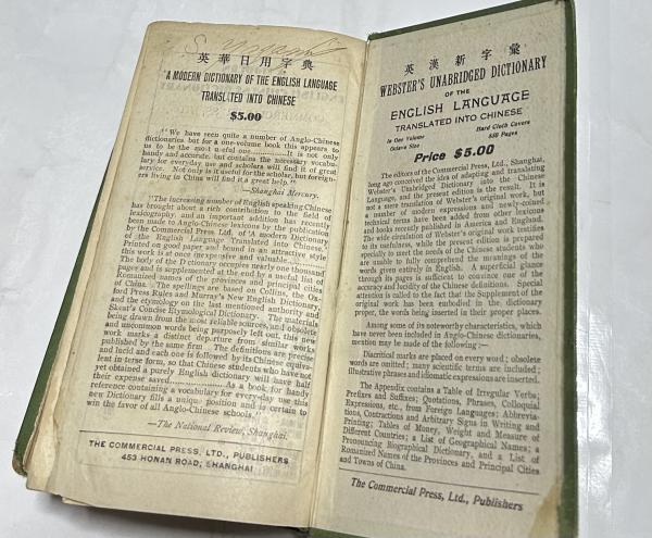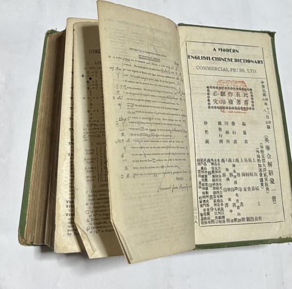 • 解説 中華民国4年初版の6年刊の5版 裸本 表紙いたみ、綴じ悪し 前見返しにテープ補修 両見返しにアルファベットで書き込み 角折れ 最終頁余白に印 58+本文1531頁 絵入 英中辞典 10.5x18x6cmの小型判厚冊
