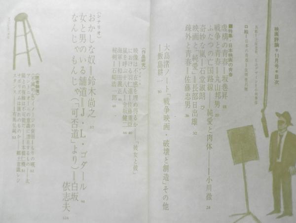 特集/日本映画の青春 虚構の青春/坂巻昇 戦争と青春/丸山邦男 ふたつの亡国路線・純愛と肉体/小川徹 奇妙な嵐/石堂淑朗 映画と「純愛」/長部日出雄 疎外と青春/佐藤忠男 大島渚ノート「戦争映画・破壊と創造」その他/飯島耕一 シナリオ おかしな奴/鈴木尚之 女と男のいる舗道/J・L・ゴダール なんじゃもんじゃ/白坂依志夫 他