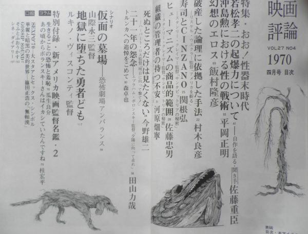 若松孝二の起爆力について/自作を語る・聞き手・佐藤重臣 沖島勲における性の戦術/平岡正明 幻想のエロス/飯村隆彦 寿司とCINZANO/関野弘 ヒューマニズムの商品的範囲/佐藤忠男 シナリオ 仮面の墓場/山際永三監督 地獄に堕ちた勇者ども/ルキノ・ヴィスコンティ監督 特別付録/新・アメリカ映画監督名鑑2 他