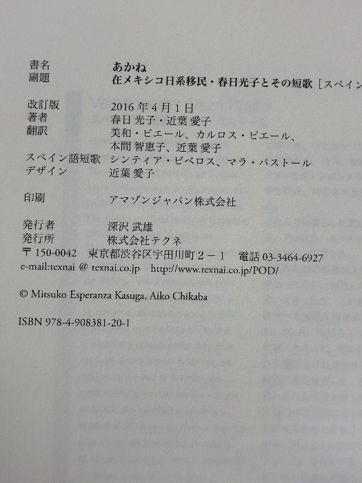 あかね ― 在メキシコ日系移民・春日光子とその短歌 ― 日・西版 Texnai 近葉 愛子