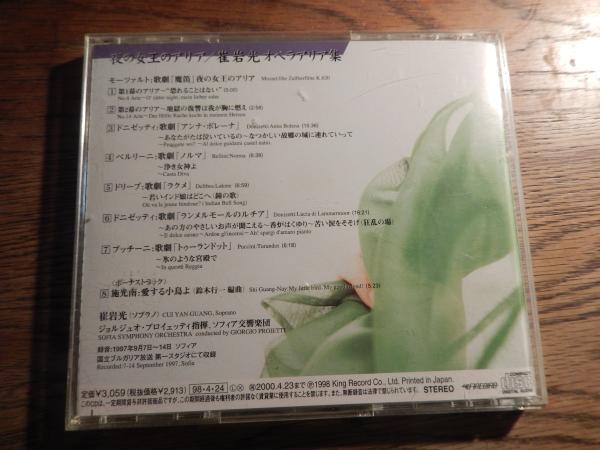 崔岩光オペラ・アリア集 夜の女王のアリア/サイ・イエングアン[崔岩光](S),ジョルジュオ・プロイェッティ(指揮),ソフィア交響楽団(so.)キングレコード(株)中国のソプラノ歌手、崔岩光のアルバム。モーツァルト、ドニゼッティ他の歌劇から女王役のアリアを集めたオペラ・アリア集。