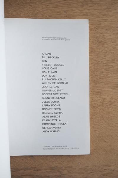 ARMAN、Bill Beckley、Ben、Vincent Bioules、Louis Cane、Dan Flavin、Don Judd、Ellsworth Kelly、Willem de Kooning、Olivier Mosset、Robert Motherwell、Kenneth Noland、Jules Olitski、Larry Poons、Richard Serra、Frank Stella、Andy Warhol ほか参加。