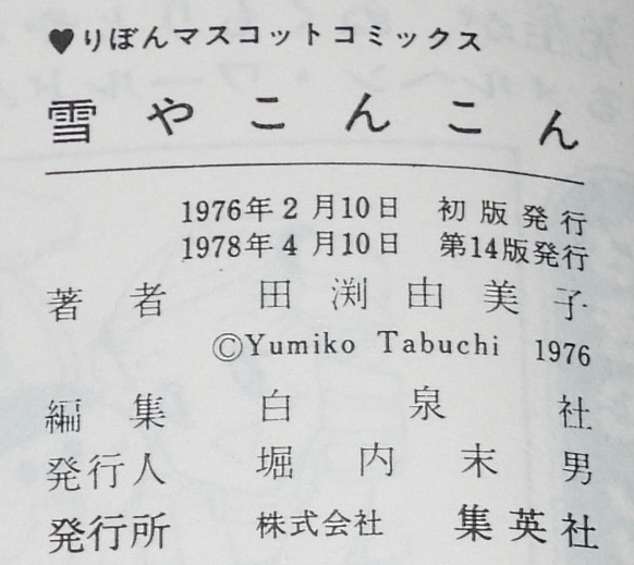 • 解説 田渕由美子傑作集1 雪やこんこん 集英社りぼんマスコットコミックス 1978年4月第14版 新書判.