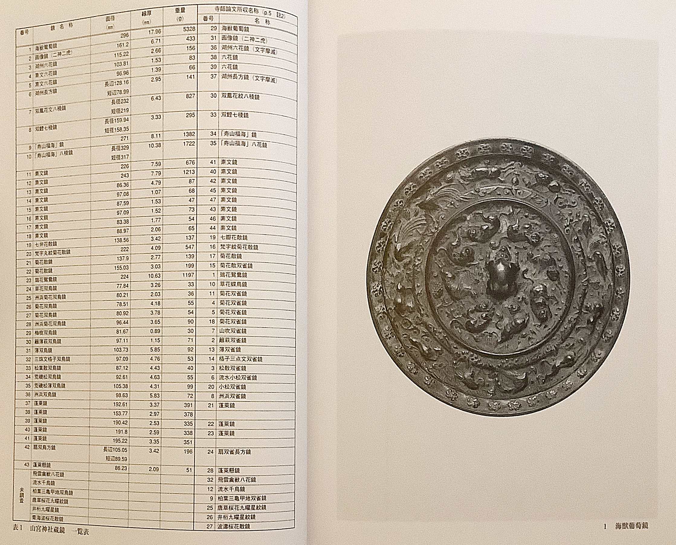 収録鏡は、中国系鏡 (漢鏡系譜を引くものを含む) および和鏡を中心に構成され、海獣葡萄鏡、双魚文鏡、四獣文鏡、花文鏡、瑞花双鳥鏡、草花文鏡、山水意匠鏡など、多様な文様・意匠を具体的作例として掲載。