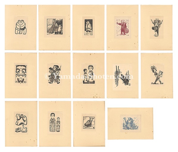 • 解説 木版各約17×11cm(シートサイズ)14枚6枚少シミ 上部台紙貼付(一部少切レ有)