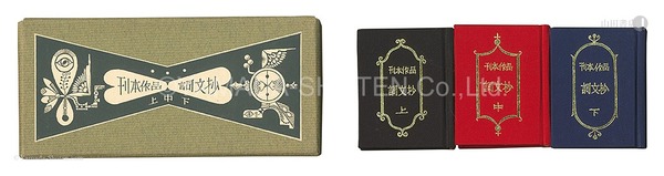 • 解説 刊本作品約60冊分の詞文のみをまとめた豆本 上中下3冊組 限500 各巻署名入 クロス装 夫婦箱 見返し少ヤケ 各7×5.6cm/8.2×17.4cm(箱サイズ)